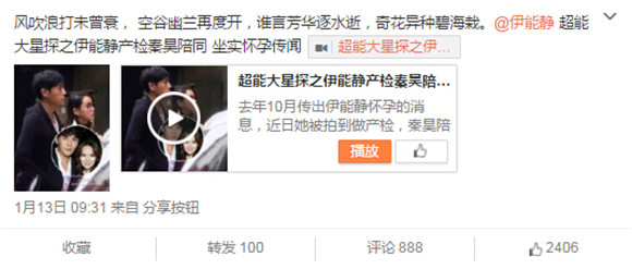 1月13日,@中国第一狗仔卓伟 更新微博,称伊能静产检秦昊陪同,坐实怀孕传闻。