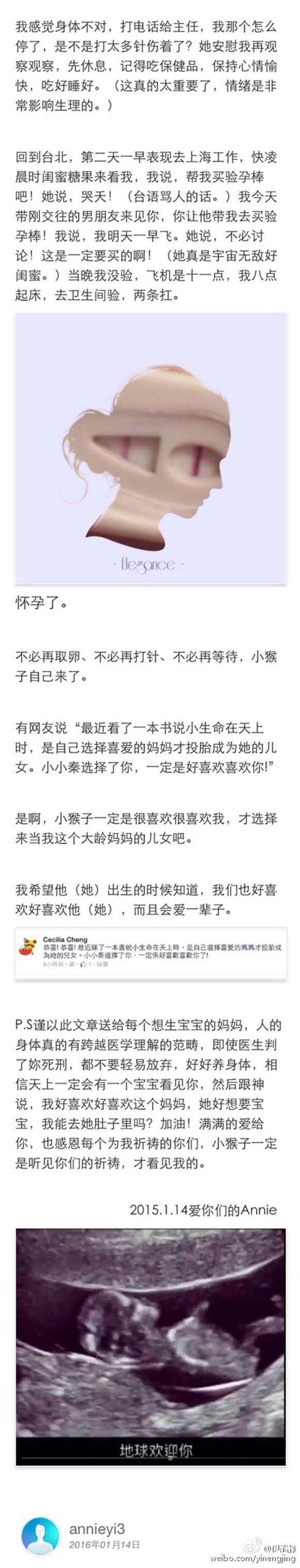 同一天晚些时候,准妈妈伊能静也通过长微博,讲述了这个孩子的来之不易。