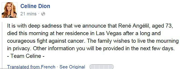 “他已与癌症做了一番艰苦勇敢的搏斗。希望大家予以我们隐私与尊重。”席琳·迪翁在脸书主页上写道。