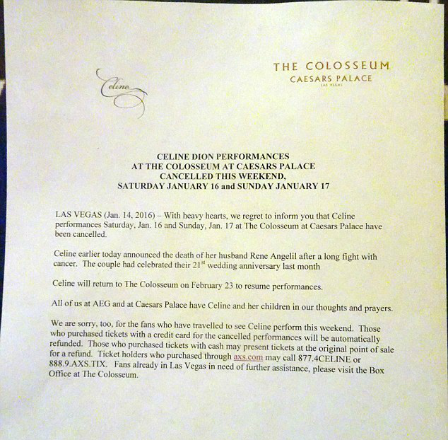 席琳·迪翁已确认将不在周六拉斯维加斯凯撒宫角斗场演唱会中演出。她在《The First Time I Ever I Saw Your Face》的歌声中,缓缓播放家庭影像,缅怀自己最爱的丈夫,最敬重的经纪人。