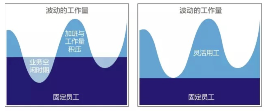 第一推动力是匹配弹性化用工需求,周期性用工需求强烈的企业和行业尤为明显。比如地产行业售楼处人员,大多来自第三方的地产代理公司,而非地产商自有员工,开售时销售人员招之即来,项目完结后挥之即去。
