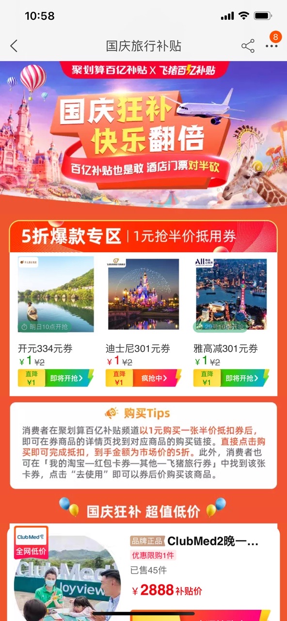 对于消费者格外谨慎的旅游行业,在聚划算百亿补贴与飞猪联手推出国庆黄金周“双百亿补贴计划”,让国庆多地热门旅游景区、乐园、酒店出现难得一见的全年低价之前,飞猪在9月8日就率先启动了旅游业首个百亿补贴计划,覆盖全国100个城市10万家酒店和热门景区乐园,上线10日内,飞猪“百亿补贴”酒店预订增长超过150%。