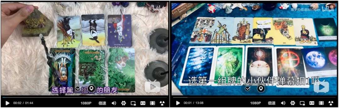 从视频播放过程的流畅度来看,B站互动视频的形式尤其符合塔罗占卜中“抽牌”的环节。再加上无时长限制,B站塔罗占卜中每组卡牌的数量也比抖音中1-3张要高,普遍集中在5-15张不等。
