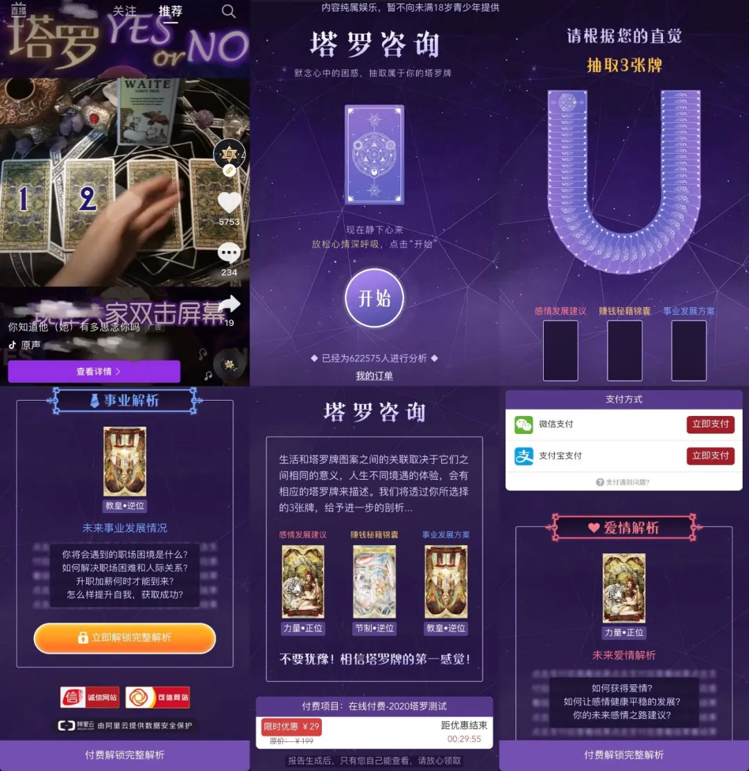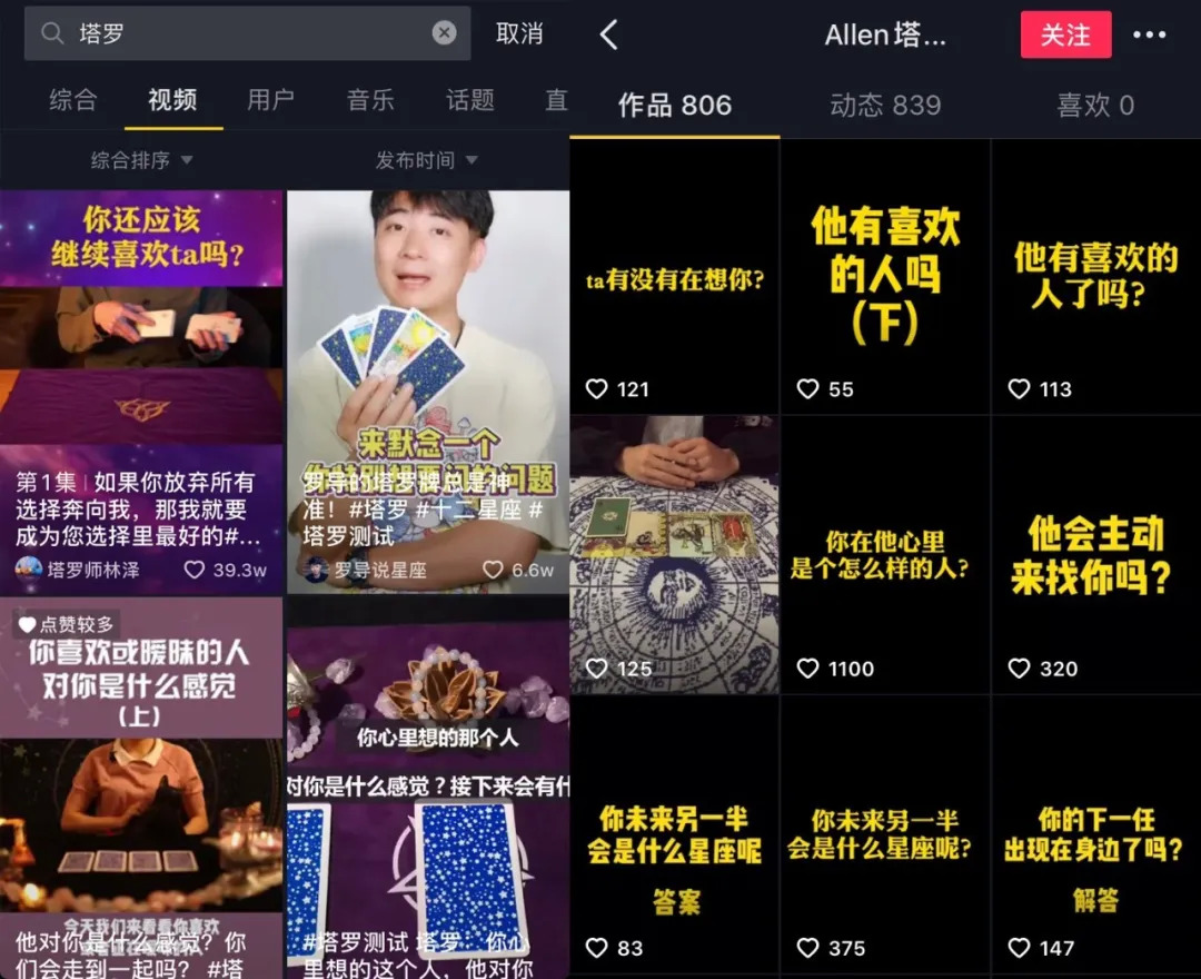 有趣的是,两者在商业化方面也有着不同的走向,对于资本玩家来说,涉猎抖音或许更唯手熟尔,抖音上的套路式塔罗占卜,是易于资本操作的。