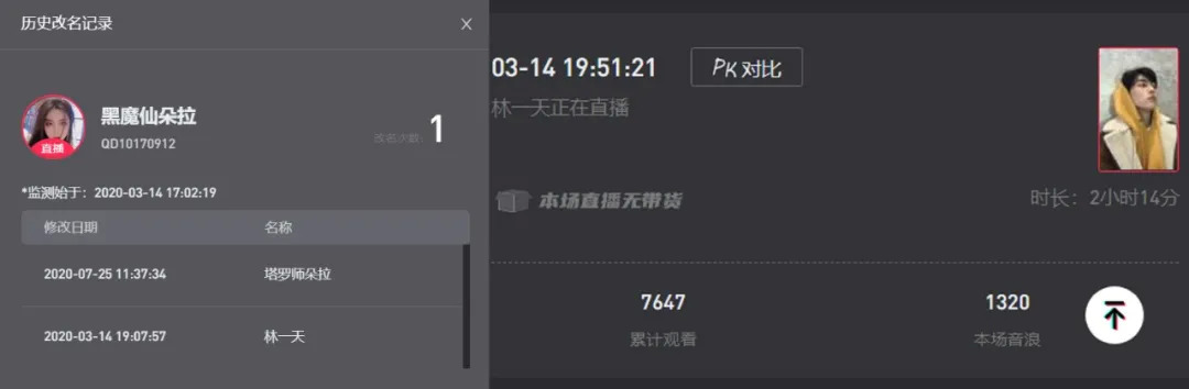 更加耐人寻味的是,据新抖显示该账号在塔罗师之前还有过一次改名记录。参考同时期的直播记录来看,推测该账号曾经或是以男生的身份进行运营。