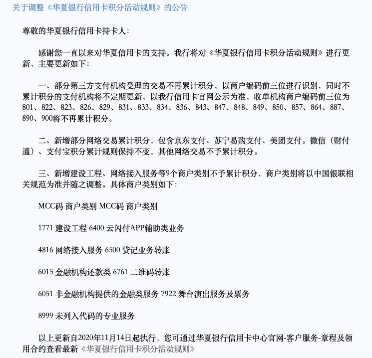 此前,民生银行和光大银行出台了信用卡积分变更政策,对19家第三方支付机构受理的交易不再累计积分。9月30日,华夏银行信用卡也发布通知称,对部分第三方支付机构不再累计积分,公布了不再受理的收单机构商户编码,将从11月14日起执行。