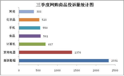 不仅如此,网络购物仍是消费者投诉热点。三季度全市消保委共受理网购商品投诉6033件,其中涉及服装鞋帽、家电、计算机、手机、食品和化妆品的投诉较多,问题主要集中在商品质量瑕疵、货不对板、夸大性能、与宣传承诺不符、退换货不及时等。