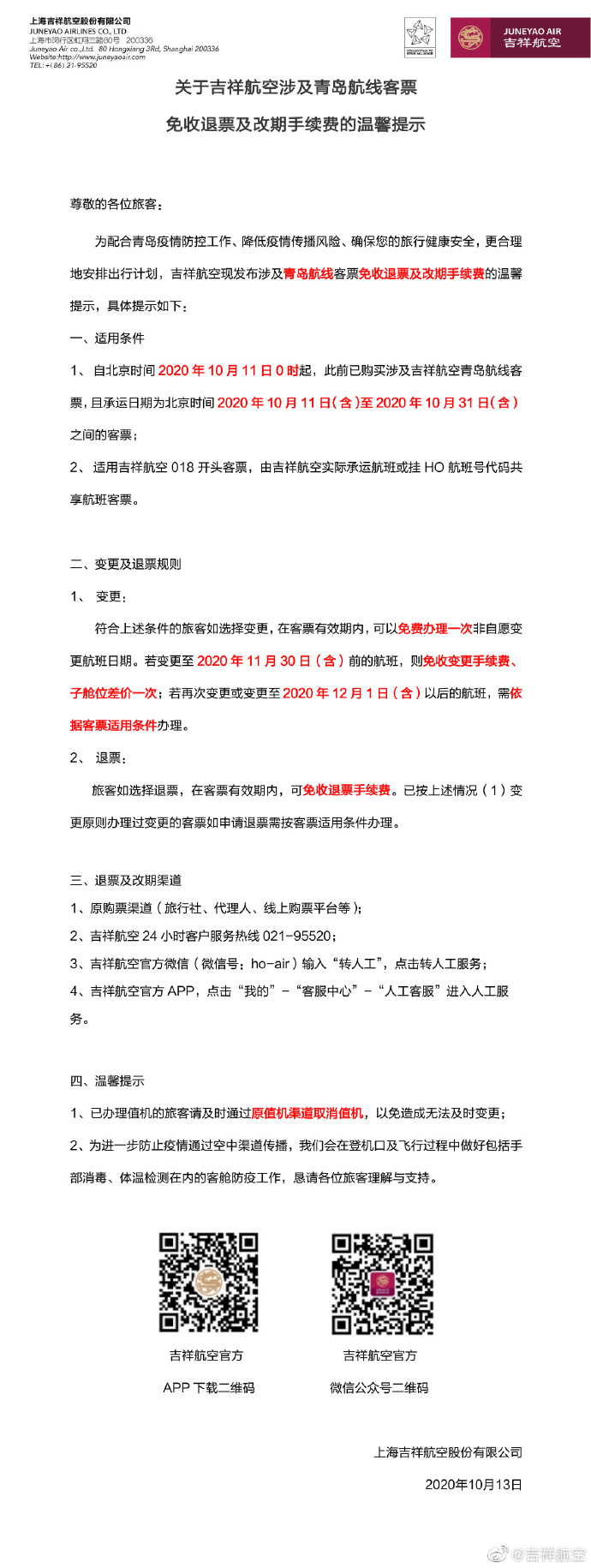 13日,吉祥航空官方微博发布提示称,吉祥航空涉及青岛航线客票免收退票及改期手续费。