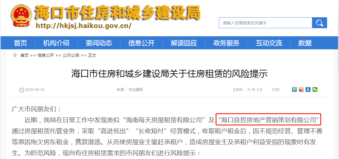 针对近期频发的房屋租赁相关问题,9月1日,海口市住建局发布房屋租赁风险提示,可以看到“海口市良哲房地产营销策划有限公司”在内的部分公司被点名采取“高进低出”“长收短付”经营模式,收取租户租金后,因不规范经营、管理不善等原因拖欠房东租金,携款潜逃。
