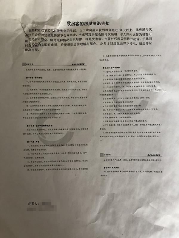 “很抱歉在双节之日打扰到您的生活,由于此房屋未收到租金超过30天以上,此房屋与代理公司合同终止……10月2日房屋会停水停电,请您及时搬离房屋。”10月1日,小东刚回家,就发现门上贴了一张“房屋清退告知单”,迷茫无助涌上心头,小东和告知单上的房东郭先生电联多次协商,郭先生坚持让其重新缴纳房租再继续住,每月2600元。“房子是我自己的,之前的租金并未交给我,不可能让你白住,我和托管公司已经解约,房子想收回就收回来。”房屋清退告知单上的房东郭先生寸步不让。迷茫又无助的小东只好选择了报警。