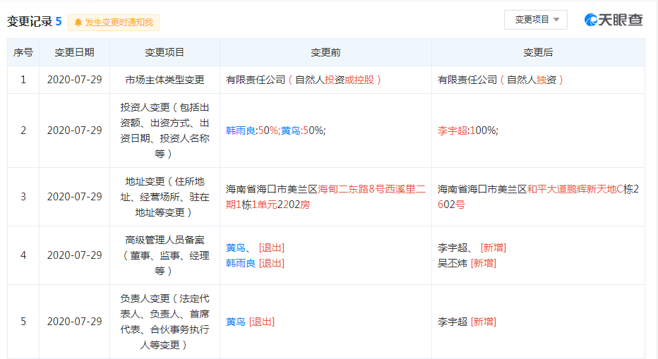 界面海南查询天眼查App发现,海口市良哲房地产营销策划有限公司成立于2019年8月30日,法人代表为黄鸟,公司经营范围包括房产中介服务、房屋租赁等。今年7月29日投资人韩雨良、黄鸟退出,而该公司的法定代表人也由黄鸟变更为李宇超。目前,拨打黄鸟联系电话,已是停机状态。