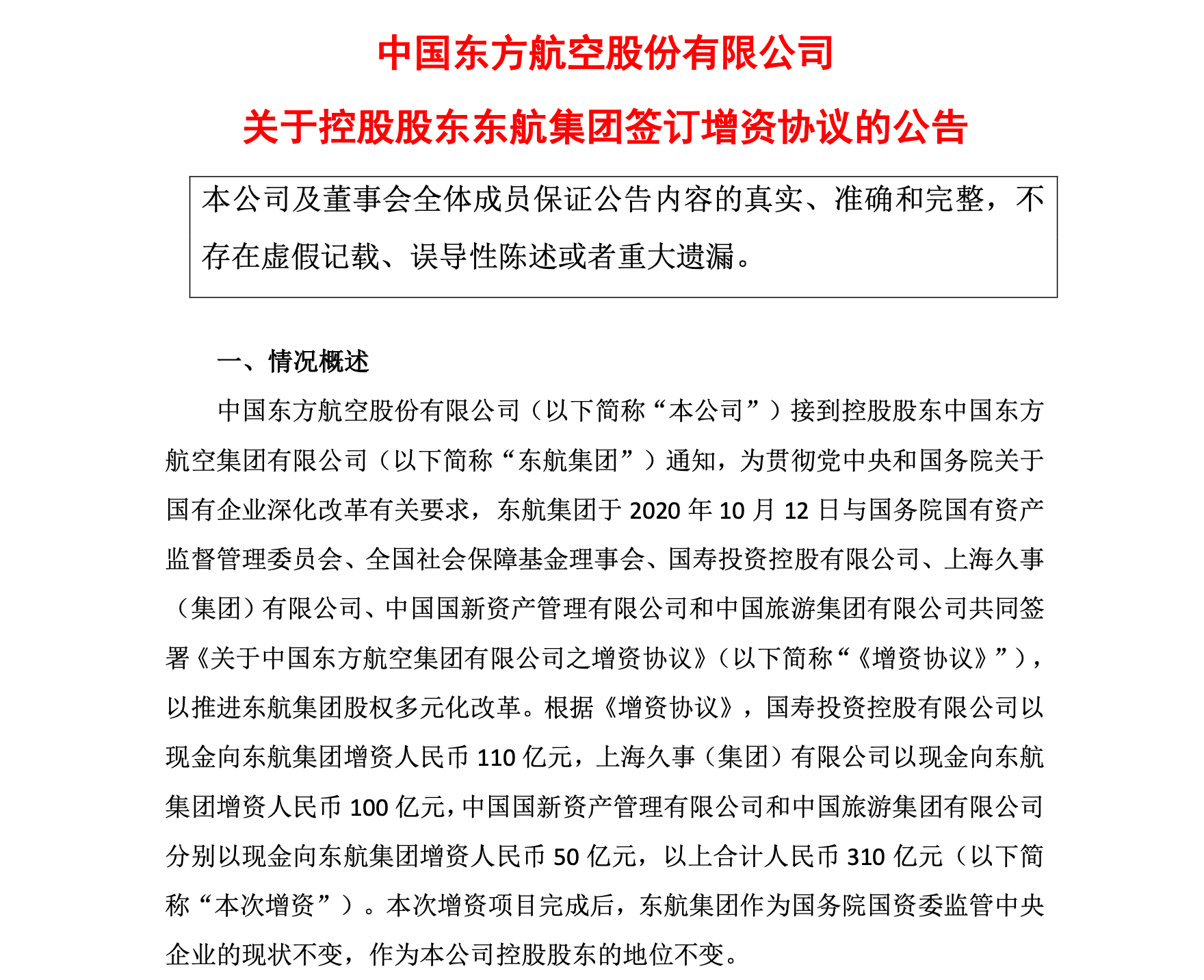 据其公告披露,东航集团引入国寿投资控股、上海久事集团、中国旅游集团及中国国新资管推进东航集团股权多元化改革,四家企业分别增资110亿元、100 亿元、50亿元、50亿元,合计增资金额达到310亿元。