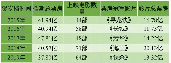 实际上,电影市场上对于贺岁档的档期时间有些概念化,以每年12月整月(12月1日-12月31日)的票房作为参考,近五年来国内贺岁档的票房体量在42亿票房左右,而该档期上映的电影最多时期超过了70部。