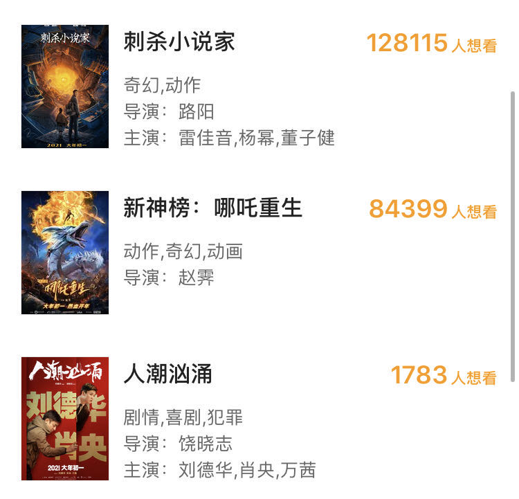 其中最显眼的是2021年春节档阵容,今年春节档遗留下的“唯二”IP电影《唐人街探案3》(以下简称《唐探3》)和《紧急救援》定档2021年大年初一,华策、阿里影业等投资出品的《刺杀小说家》与追光人动画制作的《新神榜:哪吒重生》(以下简称《哪吒重生》)、饶晓志导演的《人潮汹涌》等也加入战场。
