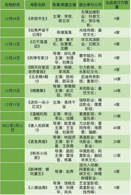 根据不完全统计,目前今年12月至明年春节档一共有23部电影宣布定档,数量并不算多,2021年1月电影市场尚且冷清,头部电影都集中在了贺岁档与春节档。