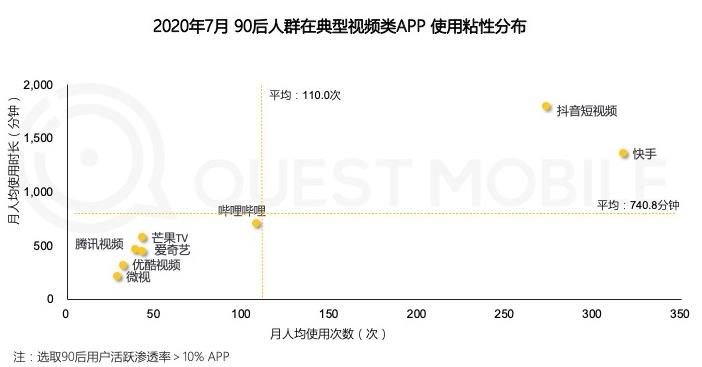 在用户时长方面,Questmobile数据显示,2020年7月,90后人群每月使用抖音和快手的用户时长远高于B站。