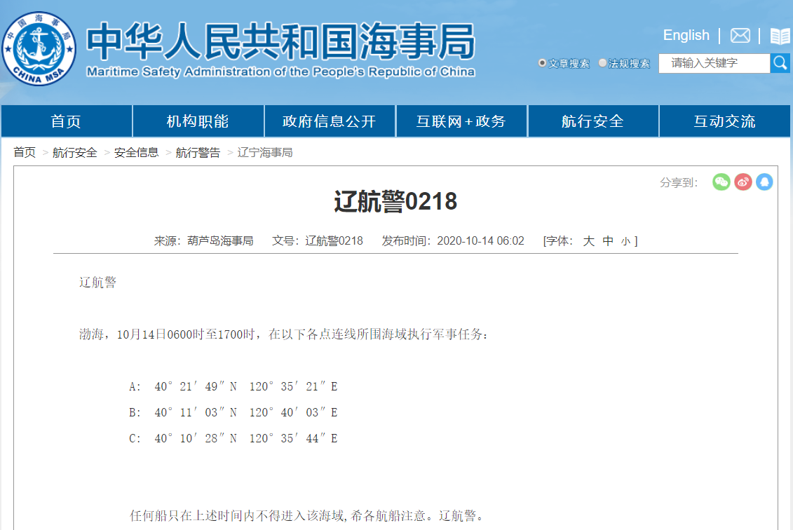 葫芦岛海事局发布航行警告:渤海,10月14日0600时至1700时,在以下各点连线所围海域执行军事任务: