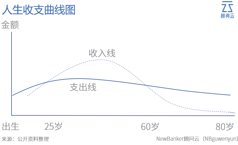 假设一个人活到80岁,大约在25岁时收入可以大于支出,在60岁后收入开始小于支出,所以收入大于支出仅有35年。