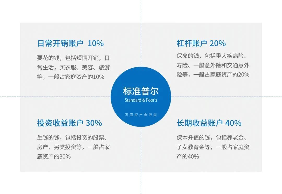 标准普尔建议的资产配置方法,别称1234法,把资产配置分成了四大块:要花的钱、保命的钱、生钱的钱、保本增值的钱,分别占了10%、20%、30%和40%。