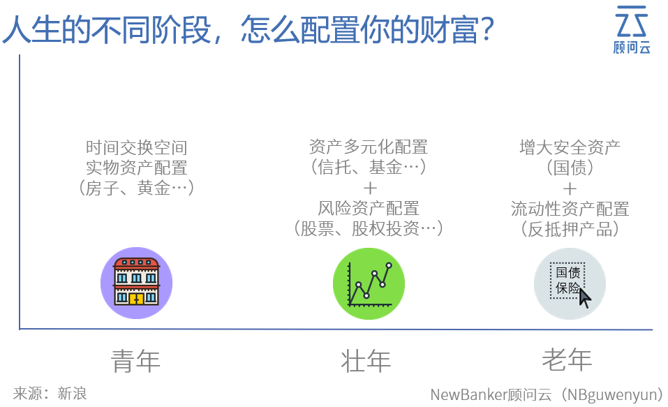 所以咱们总结一下,人生的不同阶段,咱们要这样来配置财富: