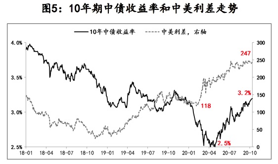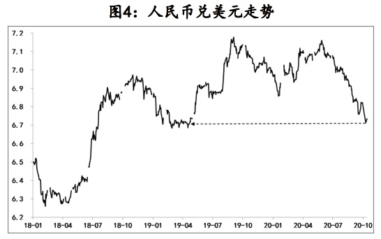 对于中国而言,美国大选不确定性和两党争夺的白热化,迫使特朗普必须集中精力处理好内部矛盾,相应针对中国的诸多不利干预将有所缓和(虽然是阶段性的),并由此带动中美双边关系紧张局势得以短暂喘息,近日莱特希泽就呼吁美国各派尽力保护好中美第一阶段经贸协议实施进程,台积电也获美方准可给华为供应部分零件。这些阶段性变化,无疑利好中国经济和金融市场,同时也有助于中国对冲美国大选引致境外市场波动的外溢性影响,近期人民币汇率已快速升值至6.7附近,10年期国债收益率更是由疫情平稳后2.5%升至3.2%,相应中美国债利率120基点扩大至250基点(一个基点等于万分之一)。