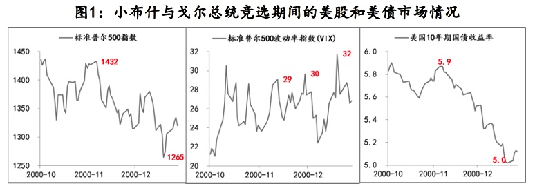 综上各类因素叠加,致使本次大选成为美国有史以来不确定性最高的一次选举。2000年11月至12月期间小布什和戈尔曾因选票风波,导致大选结果推迟至12月12日,在最高联邦法院最终判定之后,才确定小布什胜出,期间美国金融市场因选举结果不确定性出现了剧烈波动,标普500指数最大波幅超过11%,VIX脱离20的历史均值多次跳升至30附近,美债收益率则在避险情绪推动下快速下行,幅度接近一个百分点,由5.9%降至5%。
