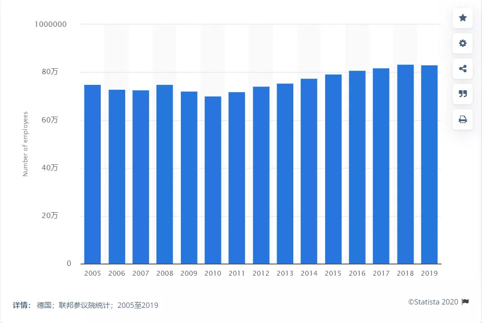 根据德国联邦参议院统计,德国汽车行业雇员人数在80万以上。