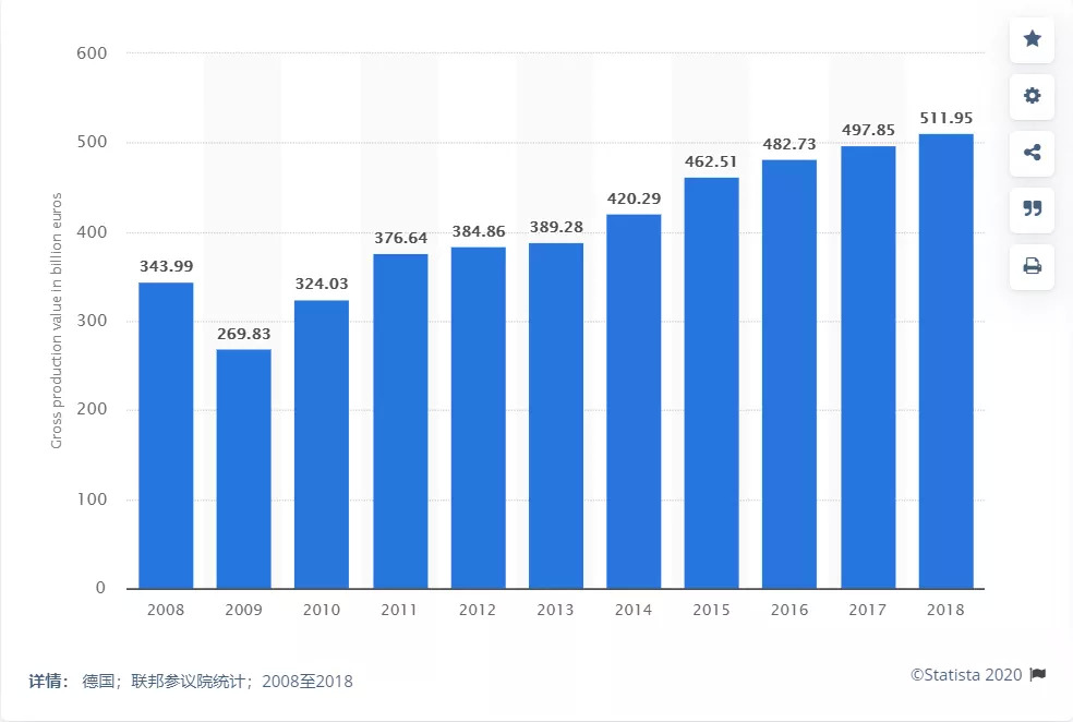 从总产值来看,2018年德国汽车行业总产值5115.9亿欧元(4万多亿人民币),约占当年GDP的15%。