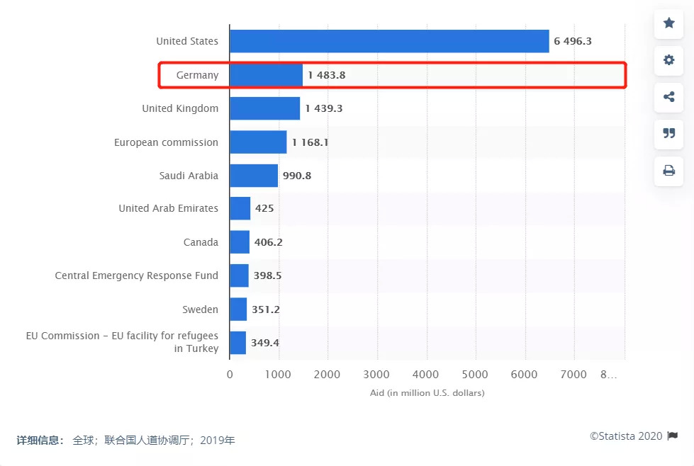 2019年全球人道主义援助几大捐助国 单位:百万美元