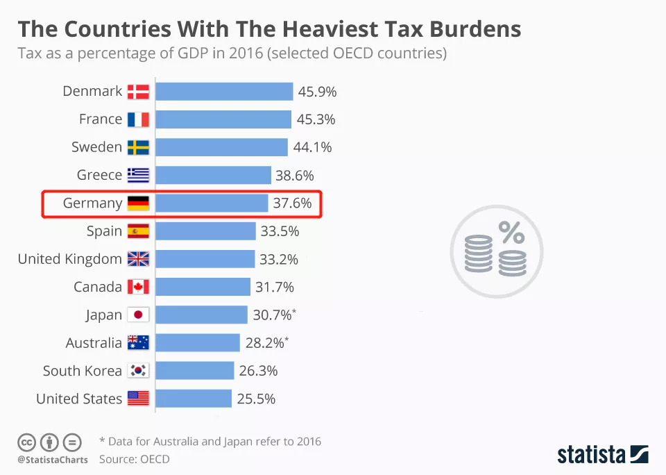 羊毛出在羊身上,税收占GDP比重,德国在经合组织中排第五