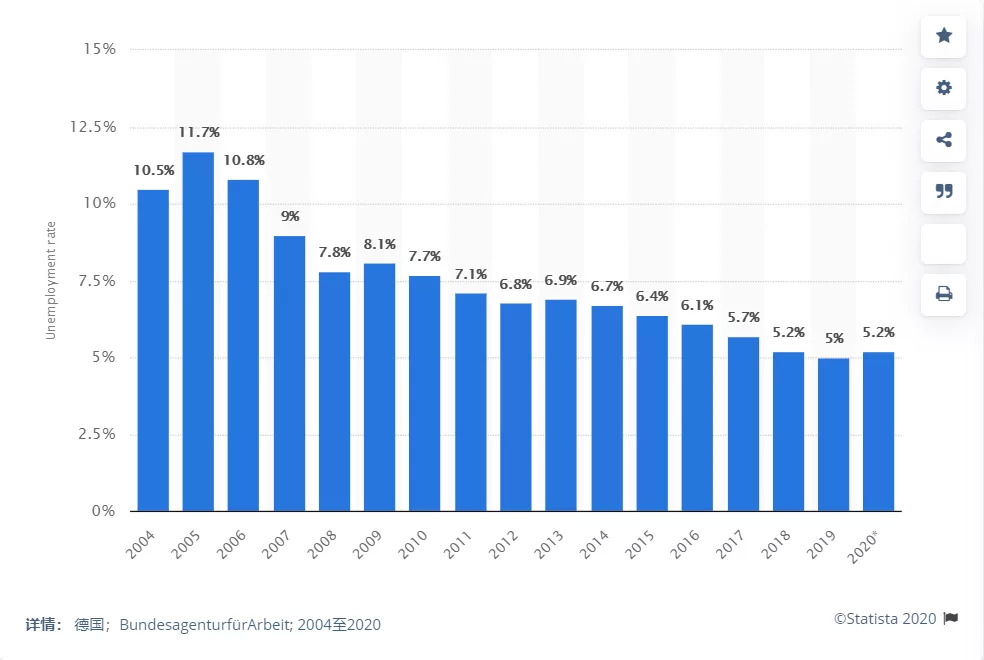 这很大程度减轻了政府的财政压力。2005年开始,德国失业率也逐步下降。