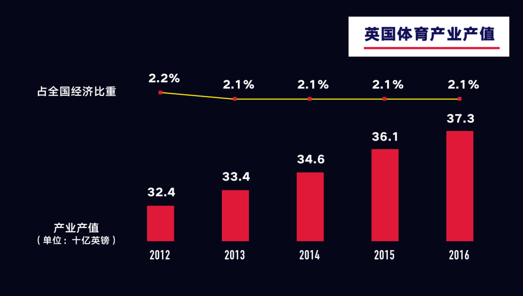在此基础上,市场这只无形的手又在不断调整、优化体育商业化的进程,最终塑造了当下的英国体育产业。根据毕马威会计事务所的统计,2016年英国的体育产业产值达到373亿英镑,占英国整体经济的2.1%。为英国创造了120万个就业岗位。