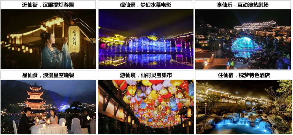 以光影赋能,主打行进式的实景体验。通过声光电、水雾火、全息投影、激光、特效等新型舞台技术及设备的应用,以“夜演、夜景、夜娱”助力“仙村”开启道教文化旅游新地标。通过逛仙街,汉服提灯游园,沉浸式体验古时游园盛会景象;观仙景,梦幻水幕电影,《归真纪》再现仙人葛玄一生的故事;享仙乐互动演艺剧场,打造玉清台、太虚幻境等19个观赏点的大型实景光影秀;品仙食,浪漫星空晚餐;游仙境,仙村灵宝集市,感受独特的文化魅力;住仙宿,枕梦特色酒店,让住客体会道家生活。出入尽享自然的六大主题特色沉浸式夜游产品,为游客呈现了一场具有丰厚道家文化底蕴的声光影艺术飨宴。