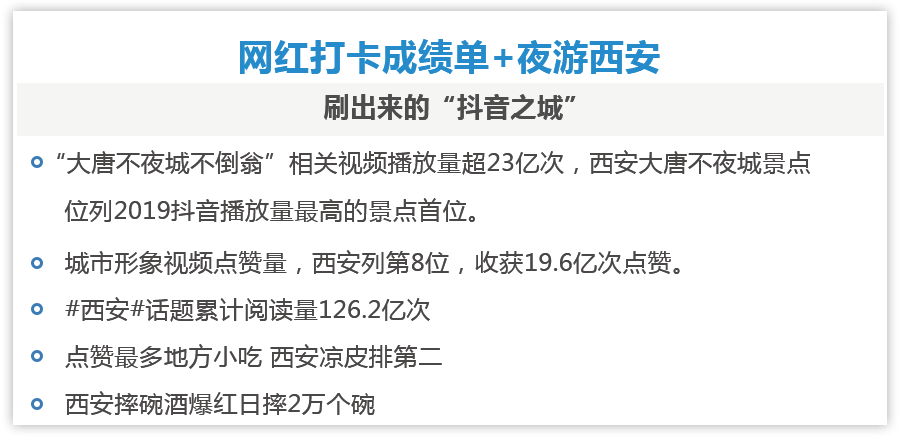 大唐不夜城被称为刷出来的“抖音之城”,西安大唐不夜城景点位列2019抖音播放量最高的景点首位,西安列城市形象视频点赞量第8位,收获19.6亿次点赞。据马蜂窝数据显示,“不倒翁小姐姐”走红之后,西安大唐不夜城旅游热度同比上420.77%,“大唐不夜城不倒翁”相关视频播放量超23亿次。西安+大唐不夜城的蹿红得益于“政策发力+宣传新模式”。