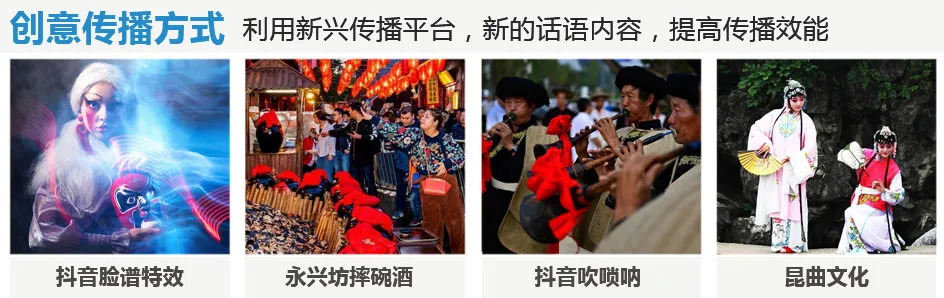 积极参与文旅元素内容再创作与分享。通过对新兴媒体传播方式的运用,让优秀传统文化真正“活”起来。让元素以文化主题创意沟通,实现大众的参与传播。如“抖音”平台使用传统戏曲京剧武旦特效变脸贴纸、大唐不夜城创造的唐代网红不倒翁小姐姐、永兴坊的摔碗酒等。