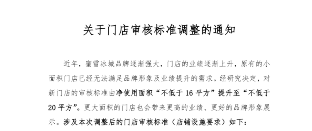 文件显示将对新门店的审核标准由净使用面积「不低于16平方」提升至「不低于20平方」,蜜雪官方给出的理由是更大面积的门店也会带来更高的业绩、更好的品牌形象展示。这是自蜜雪冰城推出加盟标准店型后的首次调整,侧面也凸显出蜜雪冰城对品牌的把控力度逐渐增加。