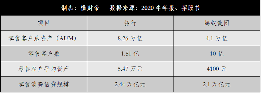 以零售之王招行为例,招行零售用户数1.51亿,零售总资产8.26万亿。而蚂蚁零售用户10亿,零售总资产4.1万亿。
