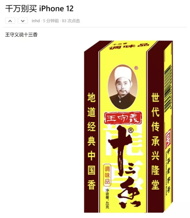 苹果公司新iPhone手机发布会将在北京时间14日进行的预热早就进行了一阵子。这次预热营销,最大的赢家可能不是苹果公司,而是一家地处河南省驻马店名叫“王守义十三香调味品集团有限公司”的知名企业(可以说是又一个“隔壁老王”)。