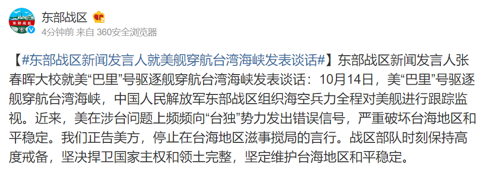 中国人民解放军东部战区官方微博消息,东部战区新闻发言人张春晖大校就美“巴里”号驱逐舰穿航台湾海峡发表谈话:10月14日,美“巴里”号驱逐舰穿航台湾海峡,中国人民解放军东部战区组织海空兵力全程对美舰进行跟踪监视。近来,美在涉台问题上频频向“台独”势力发出错误信号,严重破坏台海地区和平稳定。我们正告美方,停止在台海地区滋事搅局的言行。战区部队时刻保持高度戒备,坚决捍卫国家主权和领土完整,坚定维护台海地区和平稳定。