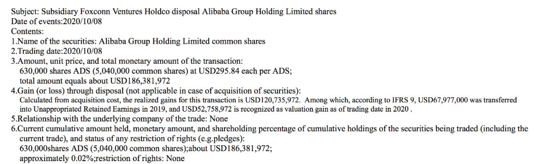 2020年10月9日,鸿海精密在向交易所提交的文件中显示,富士康创投抛售阿里巴巴股票的日期是2020年10月8日,即在阿里巴巴股价突破300美元大关之际,总交易金额为1.8638亿美元(约合人民币12.5亿元)。