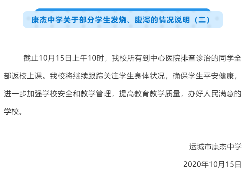 10月15日,运城市康杰中学微信发布《康杰中学关于部分学生发烧、腹泻的情况说明(二)》。提到,截止10月15日上午10时,康杰中学所有到中心医院排查诊治的同学全部返校上课。学校将继续跟踪关注学生身体状况,确保学生平安健康,进一步加强学校安全和教学管理,提高教育教学质量,办好人民满意的学校。