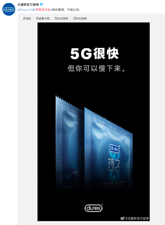今年呢,@杜蕾斯 还是一如既往跟进,iPhone出5G,由于去年的新机没有,今年算是一个新闻点吧,5G不是很快嘛,杜蕾斯就反向操作,让你别那么快,创意倒也简单清晰,如下: