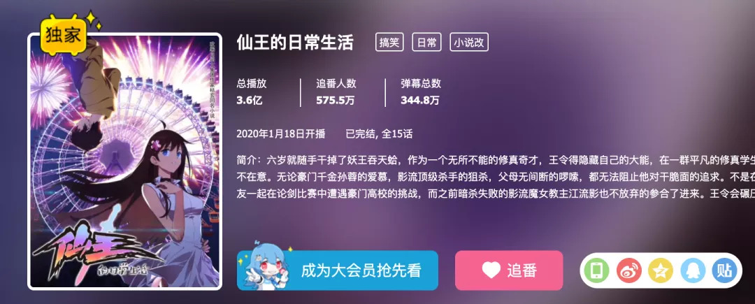 据了解,截至2020年10月14日,B站在过去三年里投资出品的动画中,播放量最高的国产动画就是《仙王的日常生活》。这部作品以29天播放破亿、总播放量3.6亿的成绩位居2020年B站自制出品动画播放榜首,紧随其后的《元龙》总播放量也有2.5亿。