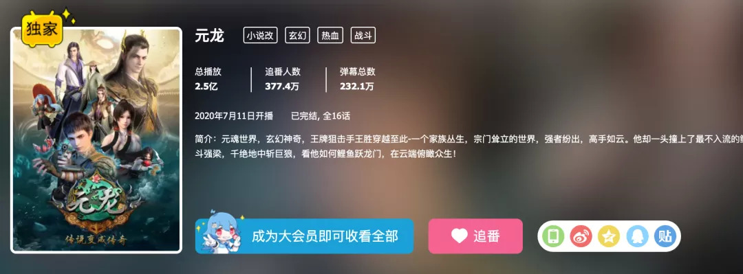 值得注意的是,B站不仅是国产动画《仙王的日常生活》和《元龙》的出品方,也是其背后制作公司绘梦动画和中影年年的投资方。