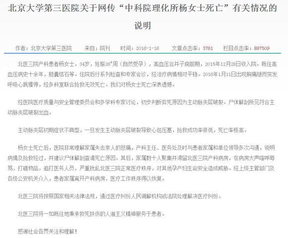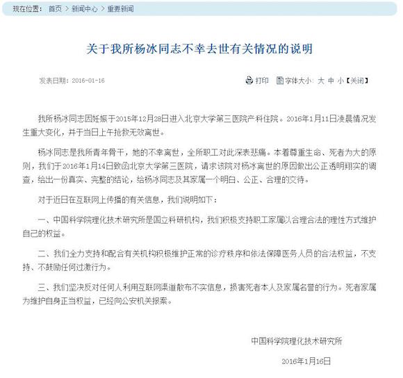 1月16日,北京大学第三医院官方网站就“中科院理化所杨女士死亡”事件发布声明称,产科患者杨女士,26+周(自然受孕),1月11日出现胸痛继而突发呼吸心跳骤停,经多科室联合抢救无效死亡。