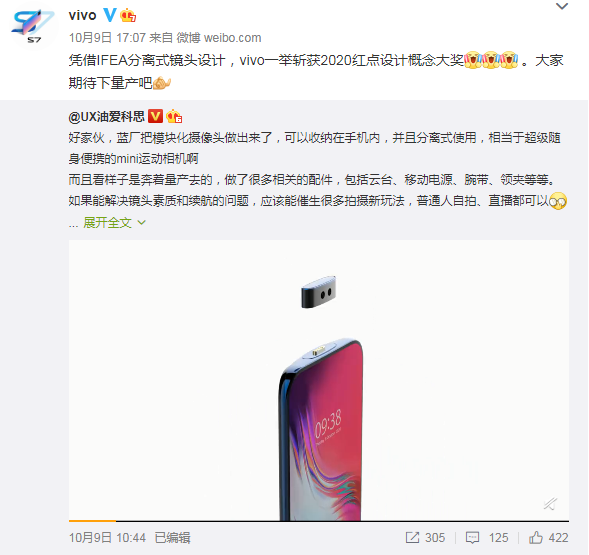 10月9日消息,vivo工业设计团队凭借vivo IFEA(Interest Free Explore Amazing)分离式镜头设计,在来自52个国家的4170件作品中脱颖而出,荣获红点设计概念奖。