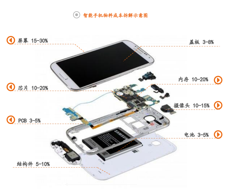 手机主要由显示屏、摄像头、芯片、PCB、内存、电池构成。在这几个部分中,芯片、显示屏、摄像头升级带来的改变是比较直观的。