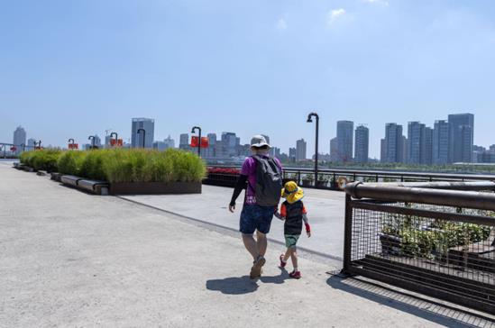 一位父亲带着孩子漫步杨浦滨江。人民网记者 翁奇羽摄