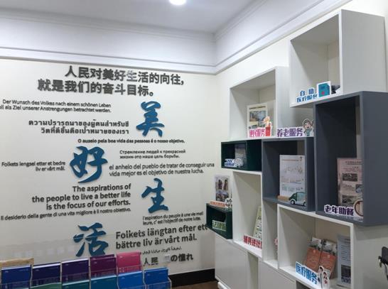 在古北市民中心一楼的墙面上,用13种文字书写“人民对美好生活的向往,就是我们的奋斗目标”,体现国际社区特点以及对美好生活的共同愿景。而这样的愿景依靠社区居民的共同建设。