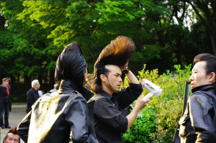 东京Rockabilly俱乐部成员们喜欢穿皮衣皮裤皮靴,用超多发胶把头发梳得油光水亮。三十年来,他们每周日都会聚在Meiji-Jingumae站附近的代代木公园,重温已逝年代的反叛精神。